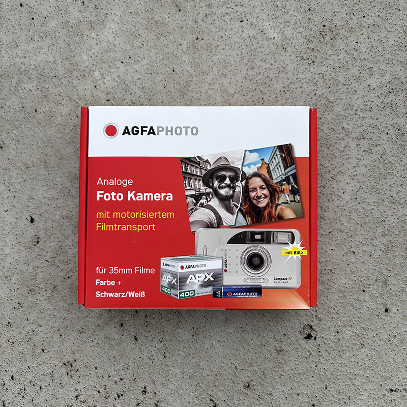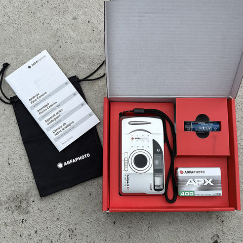 ompact and easy to use, this reusable analogue camera lets you capture unique moments with a retro touch. This pack includes 1 grey motorized film camera, 1 APX400 B&W film, 1 storage pouch and 1 battery. Take 36 vintage-style photos right out of the box!